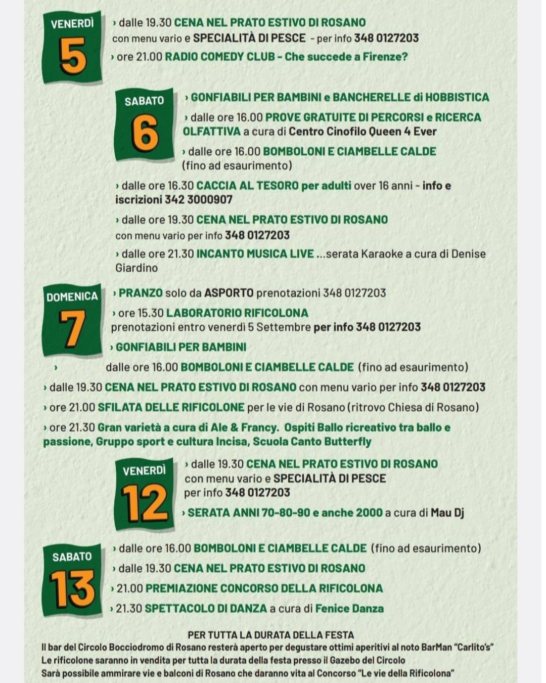 L'evento si terrà presso il Circolo Bocciodromo di Rosano, e durante tutte le serate si potranno gustare ottimi aperitivi, nonché acquistare le rificolone. Venerdì e sabato dalle 19:30 si potrà cenare presso il prato estivo di Rosano, la domenica anche a pranzo ma solo da asporto.