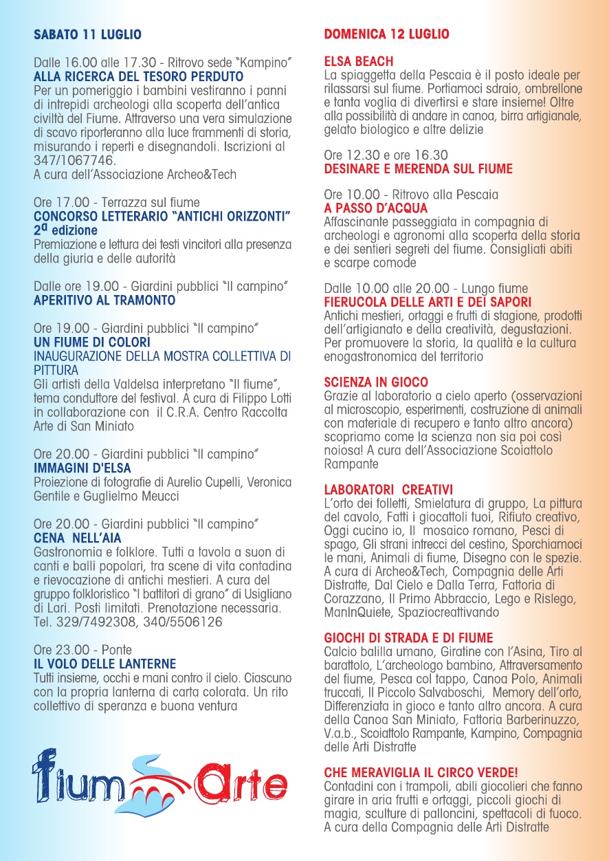 Per due giorni il fiume Elsa sarà teatro di varie iniziative all'insegna di arte, laboratori, giochi, sport e gastronomia. Per conoscere il programma completo delle iniziative è possibile scaricare la brochure in formato JPEG.