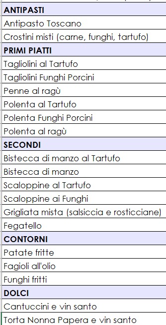 La festa si porta dietro anche le tradizioni gastronomiche locali, esaltate dal tartufo estivo, dal fungo porcino e altre specialità tipiche che si potranno assaporare sabato a cena e domenica sia a pranzo che a cena presso gli stand gastronomici allestiti per l'occasione. Si potranno gustare tagliolini al tartufo oppure ai funghi porcini, polenta ai funghi porcini oppure al tartufo, bistecca di manzo al tartufo, grigliata mista e molto altro. Non è necessaria la prenotazione. QUI si può consultare il menù.