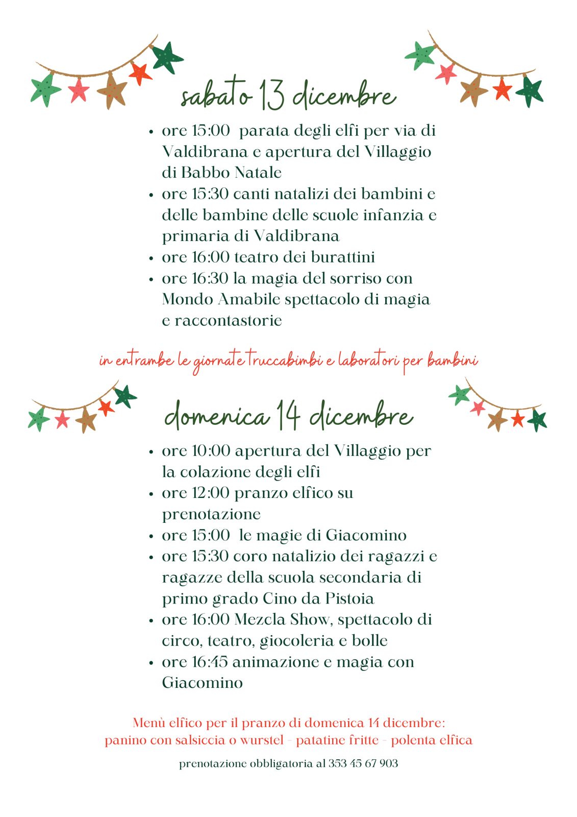 Nel Villaggio potrete giocare con gli elfi, costruire con le decorazioni natalizie, assistere al teatro dei burattini fare merenda con necci, polenta fritta, ciambelle. Saranno presenti truccabimbi e laboratori per bambini in entrambe le giornate.