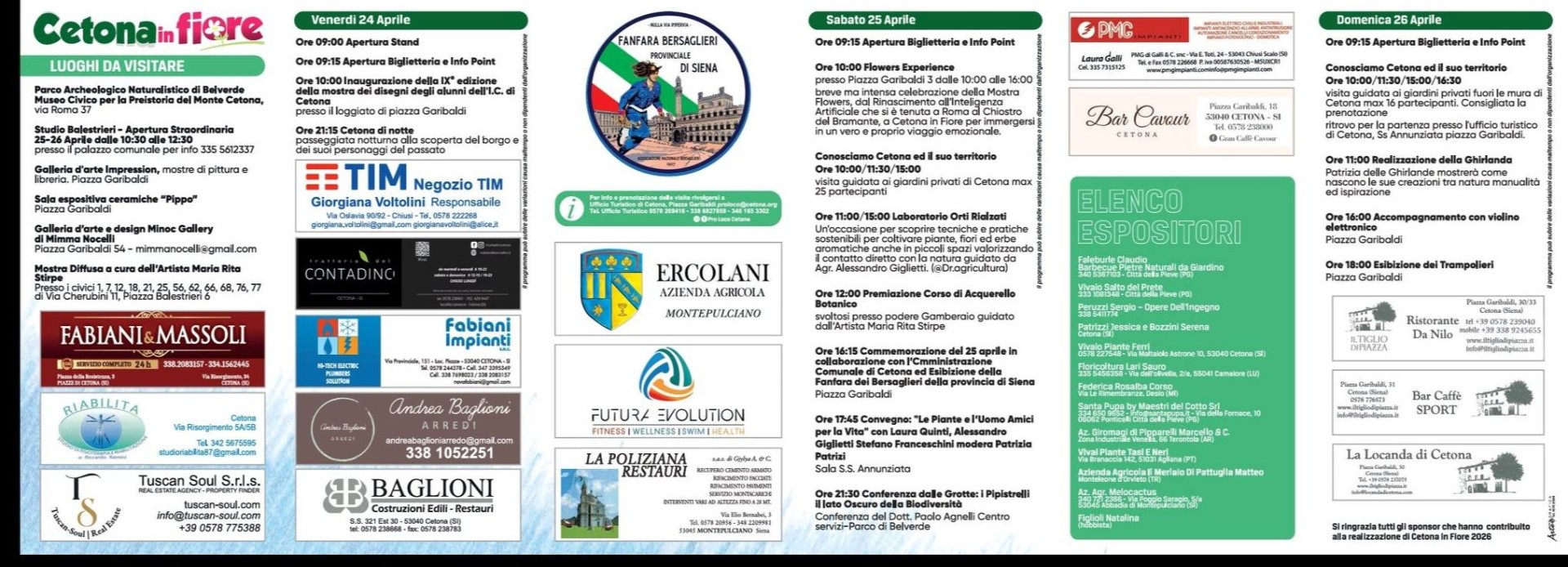 Il programma di Cetona in Fiore include inoltre iniziative culturali, passeggiate urbane alla scoperta degli angoli più suggestivi e sconosciuti del borgo, visite ai giardini privati delle case del centro storico e della campagna cetonese, laboratori ed esibizioni.