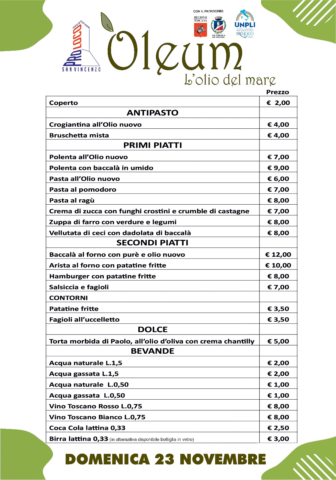 A partire dalle 11.00, nella Sala Auser, si potrà imparare a degustare l’olio con Andreina dell’Azienda Agricola Lugudoro, mentre nella sala interna della Cittadella il pranzo Aggiungi un posto a tavola (dalle ore 12.30) offrirà prodotti tipici locali. Per il pranzo è gradita la prenotazione chiamando il numero 338 2060199. Consulta QUI il menù.