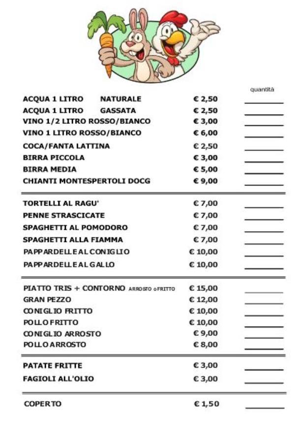Saranno infatti piatti a base delle carni di questi due animali ad arricchire il menù della sagra che prevede vari primi, tra cui pappardelle al sugo di coniglio oppure al sugo di gallo, quindi tra i secondi ovviamente pollo o coniglio arrosto oppure fritto. Per annaffiare il tutto ci sarà del buon vino: chi lo vorrà potrà provare l'ottimo Chianti Montespertoli DOCG, mentre in alternativa c'è il classico vino della casa.