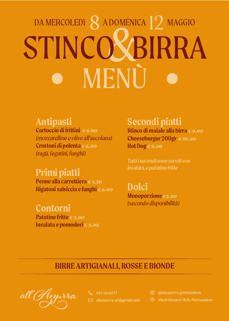 Da mercoledì 8 a domenica 12 maggio a Pontassieve (FI), presso il bar del circolo dell'S.M.S Croce Azzurra, si terrà la Stinco e Birra.