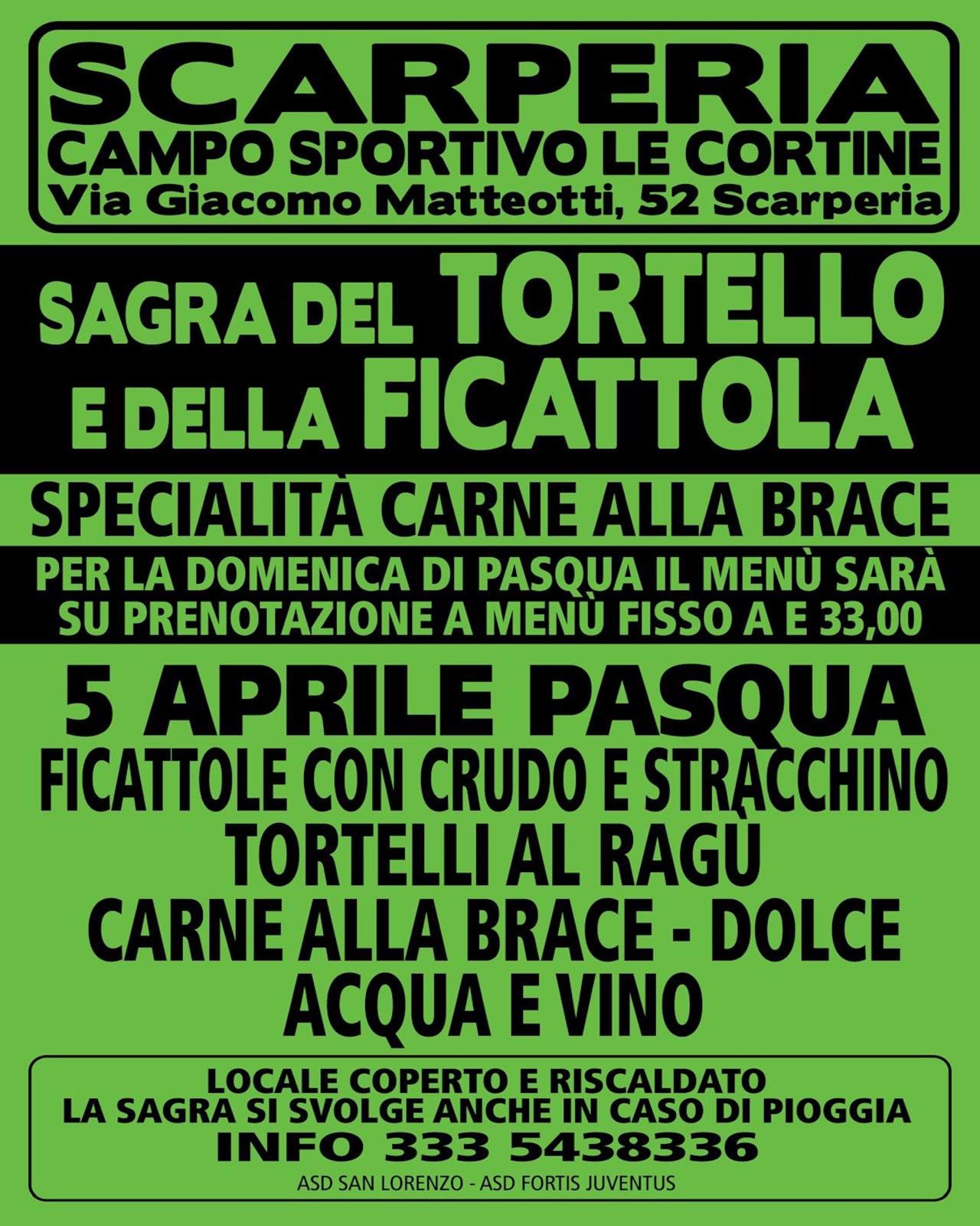 Nei weekend del 21–22 e 28–29 marzo e 4–5 aprile, al Campo Sportivo Le Cortine di Scarperia, nel Comune di Scarperia e San Piero (FI), arriva la Sagra del Tortello e della Ficattola.