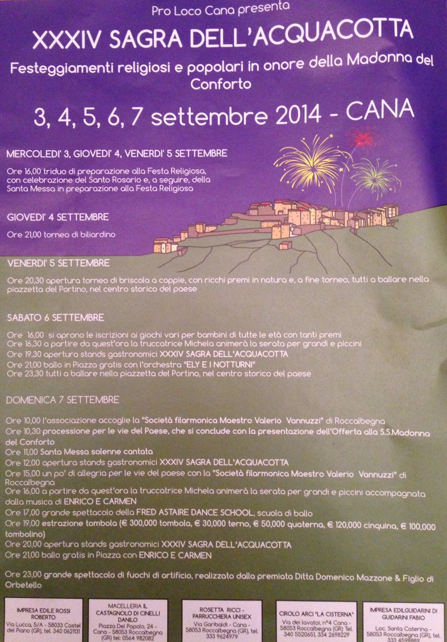 Si svolgerà sabato 3 domenica 4 settembre a Cana, frazione del comune di Roccalbegna (GR), la 36ª edizione della Sagra dell'Acquacotta.