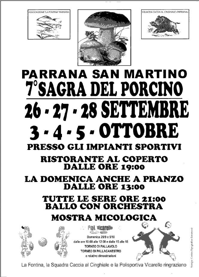 Torna a Parrana San Martino, frazione del comune di Collesalvetti (LI), il 16-17 e 23-24 settembre e il 30 settembre-primo ottobre, la Sagra del Porcino.