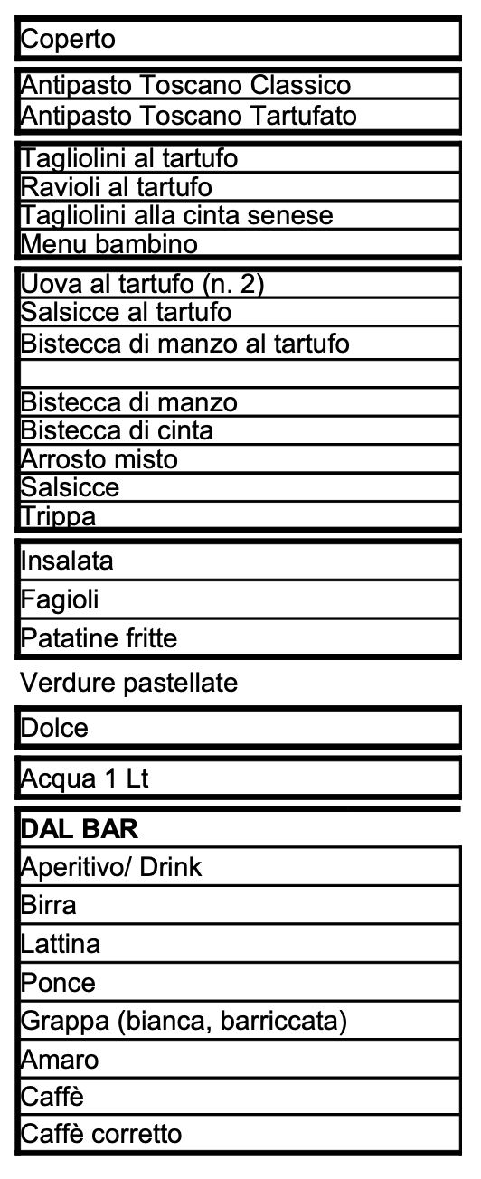 Il ricco menù prevede, fra le altre pietanze, tagliolini al tartufo, ravioli al tartufo, tagliolini al ragù di cinta senese, uova al tartufo, bistecca di manzo al tartufo, bistecca di cinta, trippa. Inoltre sarà possibile usufruire del servizio di asporto. Disponibile anche un menù bimbi. Visualizza QUI il menù.